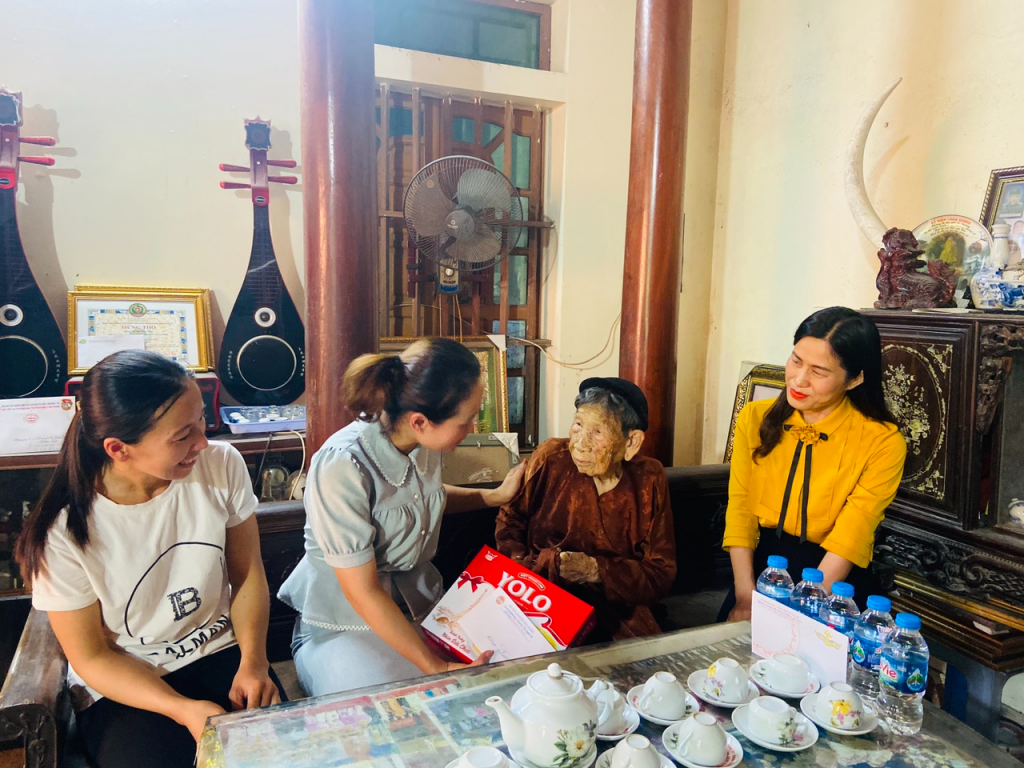 Đ/c Nguyễn Thị Nhung–Chủ tịch Hội Nông dân huyện Thủy Nguyên thăm hỏi và tặng quà Mẹ Việt Nam anh hùng Lê Thị Đích xã Kênh Giang, huyện Thủy Nguyên