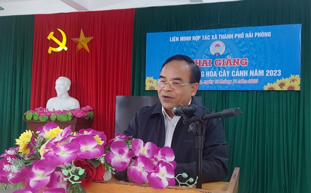 Phát biểu khai giảng lớp tập huấn, Ông Ngô Ngọc Khánh – Chủ tịch Liên minh Hợp tác xã thành phố Hải Phòng thông tin về thực trạng và định hướng phát triển trồng hoa, cây cảnh trên địa bàn thành phố cũng như tại huyện An Dương. Theo đó, nhằm thực hiện giải pháp tái cơ cấu ngành nông nghiệp, nâng cao sức cạnh tranh, giá trị gia tăng và phát triển bền vững, thành phố xác định: Phát triển chuỗi giá trị ngành hàng cây hoa, cây cảnh là một trong những ngành hàng chủ lực trong ngành trồng trọt; xây dựng các địa phương có tiềm năng trở thành làng nghề sản xuất hoa cây cảnh tập trung gắn với phát triển dịch vụ du lịch cộng đồng; đa dạng hóa sản phẩm hoa cây cảnh truyền thống kết hợp với những loại hoa mới phù hợp thị hiếu tiêu dùng của thị trường trong tiến trình phát triển sản xuất nông nghiệp đô thị.