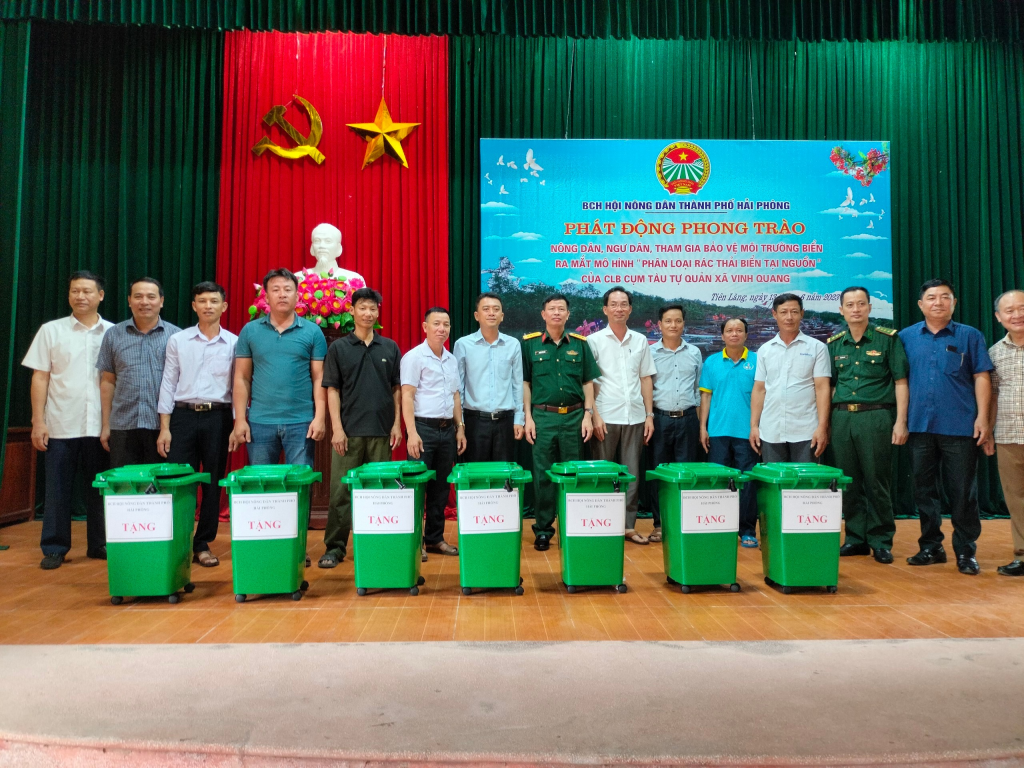 Đồng chí Trần Quang Tường, Ủy viên Thành ủy, Chủ tịch Hội Nông dân thành phố trao vật tư hỗ trợ ra mắt mô hình ”Nông dân tham gia phân loại rác thải biển tại nguồn” cho Hội Nông dân xã Vinh Quang, huyện Tiên Lãng