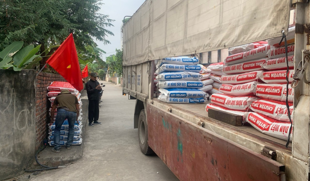 Hội Nông dân xã đang giao phân bón cho hội viên, nông dân