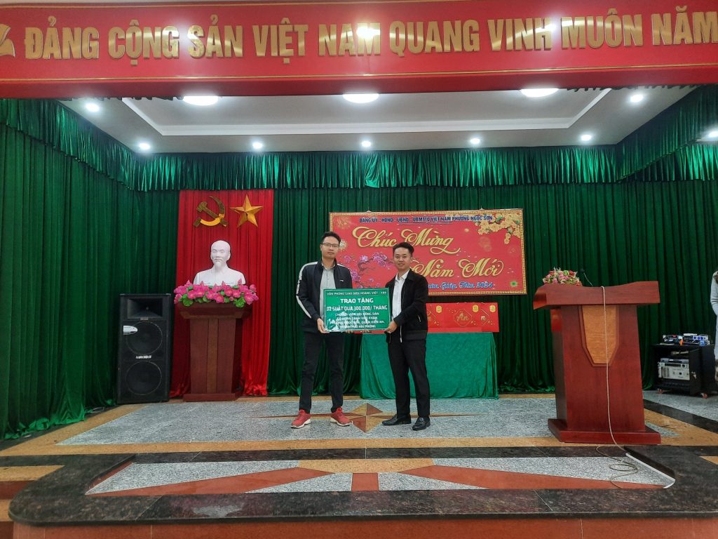 Ông Nguyễn Minh Hoàng giám đốc Văn phòng giao dịch Hoàng Việt-X88 trao biển tượng trưng tặng quà cho 02 hộ hội viên có hoàn cảnh khó khăn cho ông Đỗ Tất Hoàng Chủ tịch Hội Nông dân phường Ngọc Sơn