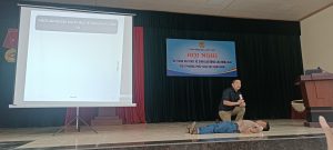 Đồng chí giảng viên của Sở Lao động – Thương binh và Xã hội hướng dẫn cách hô hấp nhân tạo cho người bị nạn đúng cách