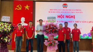 Đồng chí Hoàng Văn Tường – PCT Thường trực Hội Nông dân thành phố tặng hoa chúc mừng thành lập HTX “Phát triển thủy sản Lập Lễ” tại huyện Thủy Nguyên