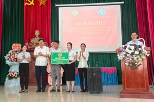 Đ/c Bùi Thị Thúy Phương – Phó Ban Kinh tế – xã hội, Hội Nông dân thành phố trao quà tại hội nghị ra mắt Mô hình “Nông dân làm kinh tế giỏi tham gia BHXH tự nguyện, BHYT hộ gia đình năm 2024” tại quận Dương Kinh.