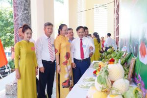 Lãnh đạo Hội Nông dân thành phố thăm quan gian hàng trưng bày sản phẩm tại Đại hội đại biểu Hội Nông dân xã Trường Tân.