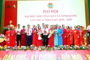 Đồng chí Nguyễn Hồng Hưng, Phó Chủ tịch Hội Nông dân thành phố, Trưởng ban Ban Công tác Nông dân tặng hoa chúc mừng Ban chấp hành Hội Nông dân xã ra mắt tại Đại hội đại biểu Hội Nông dân xã Ninh Giang lần thứ I, nhiệm kỳ 2025-2030.