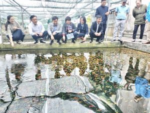 Đồng chí Nguyễn Hồng Hưng, Phó Chủ tịch Hội Nông dân thành phố, Trưởng ban Công tác Nông dân cùng các đại biểu Trung tâm Phát triển Trang trại và Doanh nghiệp Nông nghiệp Việt Nam, lãnh đạo phường Thiên Hương và hội viên nông dân tham quan “mô hình nuôi cá cảnh” tại nhà HVND Bùi Văn Thanh.